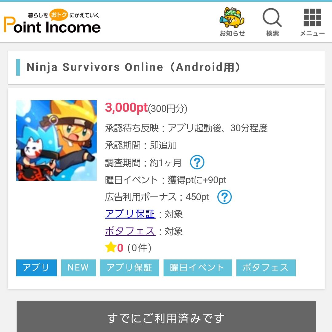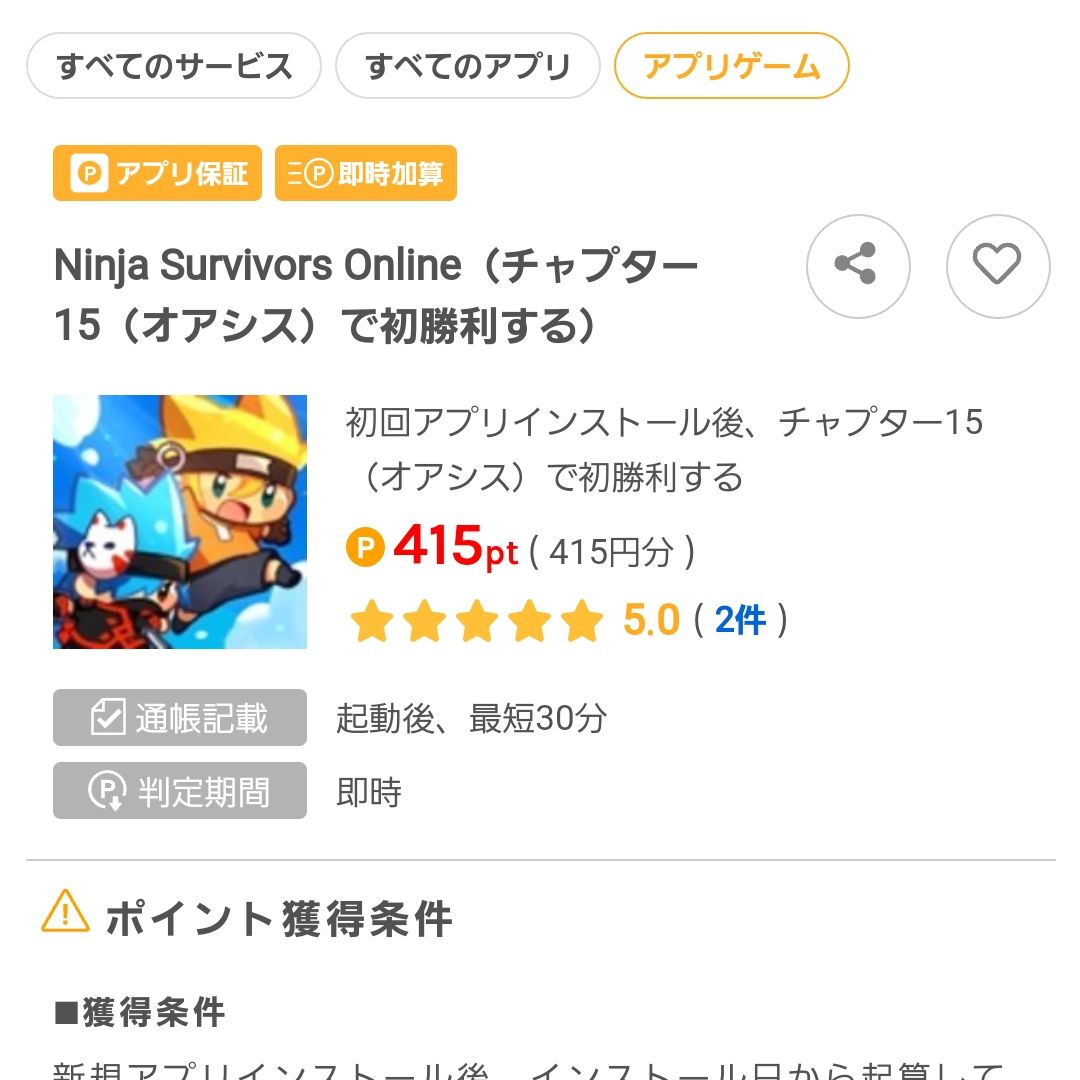 ポイ活「Ninja Survivors Online(チャプター15(オアシス)で初勝利する)」を6日でクリアしました。